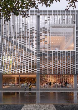 A contemporary structure within a heritage context, integrating the square into the library’s public realm