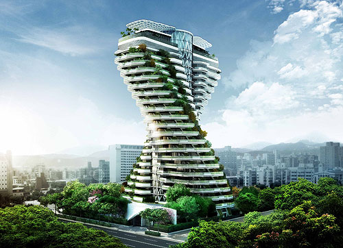 Tao Zhu Yin Yuan was designed by French architect Vincent Callebaut. The architectural design of the tower is reminiscent of a tree; with vertical landscaping climbing up the tower as the tower floors are rotated at 4.5 degree with reference to the adjacent floors in the clockwise direction. The design demonstrates Core Pacific Group's commitment to environmental protection as its prime responsibility to society, which is in line with the philosophy of Tao Zhu (an ancient Chinese chancellor in the state of Yue during the Spring and Autumn period (500 BC), and Tao Zhu Yin Yuan means the Retreat of Tao Zhu), as it reflects a graceful exit from public life, nevertheless he still valued and promoted public welfare. The tower is designed to be a "green" icon in CBD of Taipei city, adjacent to Taipei 101; over 40,000 trees will be planted on the ground floor grove and balconies of residential levels, and the public space ventilation system driven by roof-top solar energy system is just one of the many features of the tower's self-balancing design that makes it an outstanding green residential project.