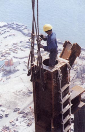 At this level - some 180 metres above the ground - a worker prepares a lifting rope for the placing of a connecting member.